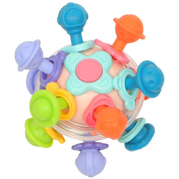 Na każdej wypustce umieszczono kolorową plastikową obręcz, która przy poruszaniu wydaje delikatne dźwięki. Dodatkowo, centralna część kuli zawiera przezroczystą grzechotkę z drobnymi kuleczkami, która aktywizuje zmysł słuchu i przyciąga wzrok dziecka.