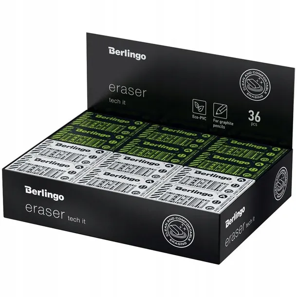 Gumki Berlingo "Tech it" wykonane są z EKO-PVC i są nietoksyczne. Doskonale radzą sobie z liniami z czarno-grafitowego ołówka, nie pozostawiają po sobie śladów i brudnych smug. Nie uszkadzają papieru.