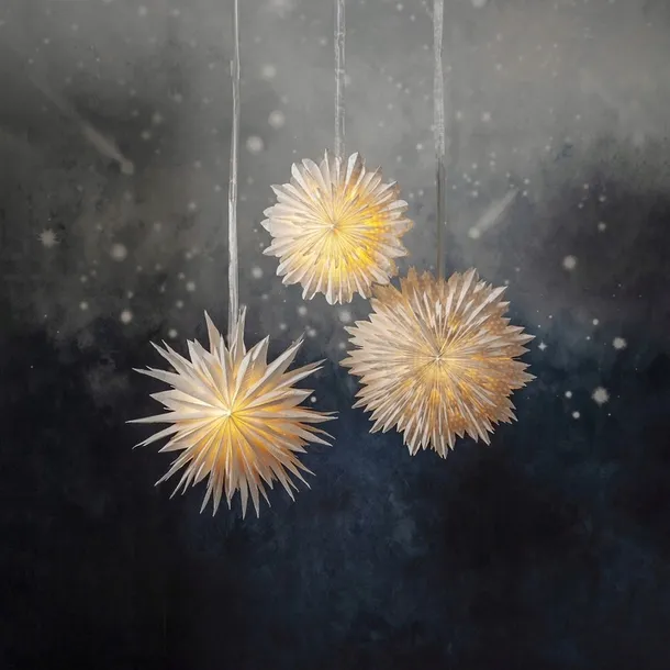 Gwiazda gwarantuje pełną elastyczność w montażu, dzięki dołączonej ozdobnej wstążce, którą łatwo zawiesisz w oknie, na ścianie czy suficie. Jej wodoodporny papier z recyklingu, miękki w dotyku i odporny na codzienne warunki, umożliwia bezproblemowe użytkowanie wewnątrz pomieszczeń, bez obaw o utratę formy.