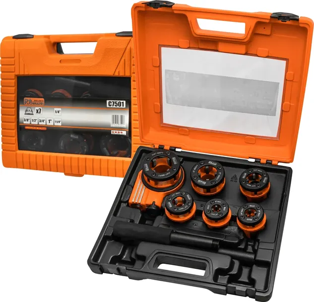 - Pozwala na łatwe i precyzyjne gwintowanie rur o średnicach: 1/4" (6.3 mm), 3/8" (9.5 mm), 1/2" (12.7 mm), 3/4" (19.0 mm), 1" (25.0 mm), 1-1/4" (32.0 mm).