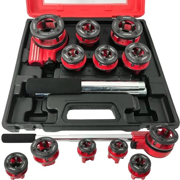 Wysokiej jakości zestaw do gwintowania rur. W skład zestawu wchodzi gwintownica ręczna z systemem grzechotkowym znacznie ułatwiającym pracę oraz przełącznik kierunku pracy. W skład zestawu wchodzi 6 głowic wymiennych w rożnych rozmiarach. Głowice wykonane są z bardzo trwałego i mocnego materiału. Zestaw zapakowany jest w plastikową walizkę wygodną w przenoszeniu oraz przechowywaniu wszystkich elementów.