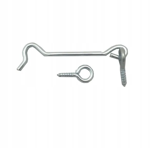 Haczyk z drutu do domykania okien, drzwi, szatni. W komplecie oczko. Gwint metryczny do wkręcania do drewna. Wykończenie w kolorze srebrnym. Nikiel