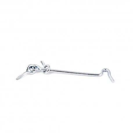Haczyk z drutu do domykania okien, drzwi, szatni. W komplecie oczko. Gwint metryczny do wkręcania do drewna. Wykończenie w kolorze srebrnym. Nikiel