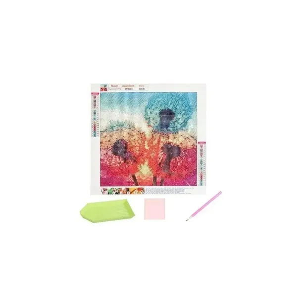 - SPECYFIKACJA – wzór: dmuchawce; wymiar: 30x30 cm; płótno pokryte warstwą klejącą: tak; w zestawie: kolorowe diamenciki, aplikator, suchy klej, pojemnik; waga: 0,1 kg; waga w opakowaniu: 0,103 kg