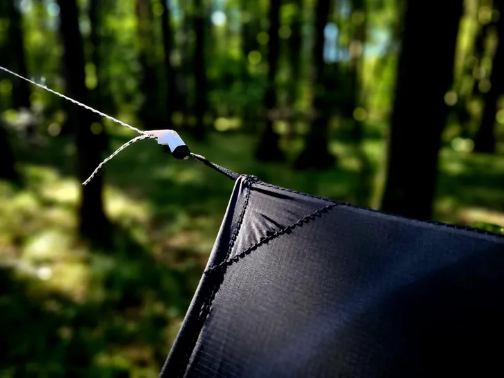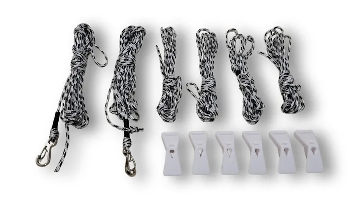 2 główne linki o długości 2,5 m każda, zakończone karabińczykiem – umożliwiają szybkie i pewne przymocowanie tarpa do drzew lub innych punktów mocowania,