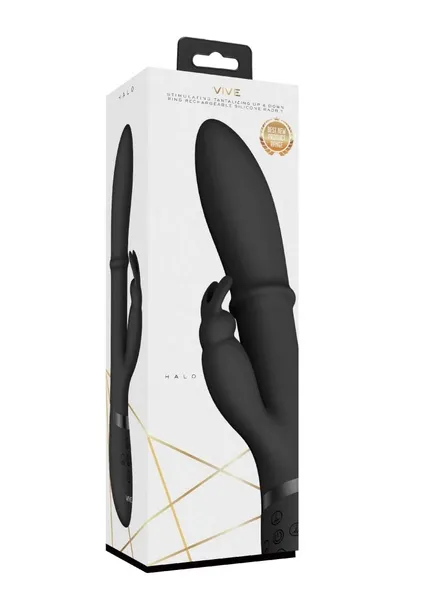 Marka VIVE High Class oznacza niezrównaną stymulację w wyniku ciągłych innowacji! Ten wibrator króliczek/punktu G z górnej półki może pochwalić się wyjątkową funkcją, która sprawi, że Twoje palce u stóp wygną się w rozkoszy. Ma stymulujący pierścień wbudowany w gładki trzon z medycznego silikonu, który porusza się w górę i dół, zapewniając ?wewnętrzny masaż, jak żaden inny. Pierścień ma 10 różnych trybów prędkości, a zarówno stymulator punktu G, jak i stymulator króliczek, mają po 10 różnych trybów wibracji, co daje kosmiczną liczbę kombinacji ustawień do wyboru.Wibrator VIVE HALO ma klasę wodoodporności IPX7 i działa na akumulator. 120 minut ładowania dostarcza 40 minut nieposkromionej przyjemności z głośnością poniżej 60dB.