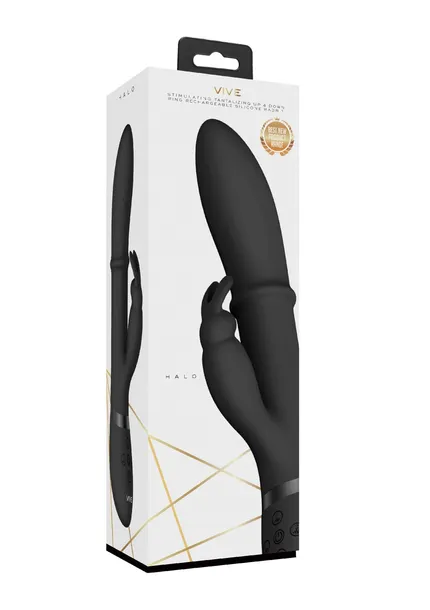 Marka VIVE High Class oznacza niezrównaną stymulację w wyniku ciągłych innowacji! Ten wibrator króliczek/punktu G z górnej półki może pochwalić się wyjątkową funkcją, która sprawi, że Twoje palce u stóp wygną się w rozkoszyMa stymulujący pierścień wbudowany w gładki trzon z medycznego silikonu, który porusza się w górę i dół, zapewniając ?wewnętrzny masaż, jak żaden innyPierścień ma 10 różnych trybów prędkości, a zarówno stymulator punktu G, jak i stymulator króliczek, mają po 10 różnych trybów wibracji, co daje kosmiczną liczbę kombinacji ustawień do wyboruWibrator VIVE HALO ma klasę wodoodporności IPX7 i działa na akumulator120 minut ładowania dostarcza 40 minut nieposkromionej przyjemności z głośnością poniżej 60dBWymiary opakowanie 31,50 x 10,20 x 7,70 cmWaga opakowanie 240 gramWymiary produktu 24,5 x 6,7 x 4,3 cmMasa produktu 240 gramŚrednica produktu 3,5 cmWprowadzana długość 14 cmLiczba silników 3Obroty 7000 RPMObroty końcówki wibrującej 8500 RPMTryby prędkości 10Poziom głośności 60 dBZ akumulatorem TakCzas ładowania 120 minCzas pracy naładowanej baterii 40 minWodoodporność TakBez ftalanów TakMateriały Silicone, ABS