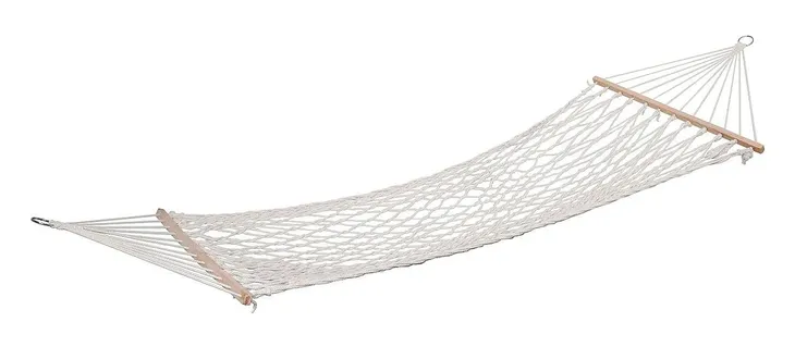 Hamak jest wyposażony w drewniane belki na obu końcach, aby zapewnić doskonałą stabilność i wysoki poziom komfortu. Pręty są naciągane linami 5 mm z miękkich i elastycznych włókien, a końce lin są zaplątane w stalowe pierścienie, aby je zawiesić.