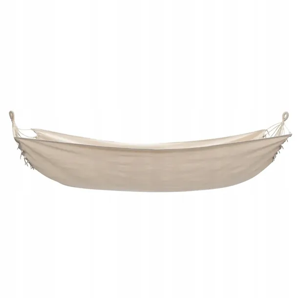 Płótno wykonane jest z bawełny i poliestru w ładnym kremowym kolorze. Dzięki dużej powierzchni 260 x 150 cm hamak jest odpowiedni dla 2 osób. Ten hamak posiada dwa tkane węzły, za pomocą których można go zawiesić na stojaku, słupie lub drzewie.
