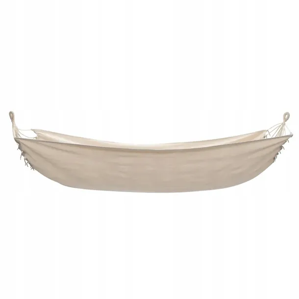 Płótno wykonane jest z bawełny i poliestru w ładnym kremowym kolorze. Dzięki dużej powierzchni 260 x 150 cm hamak jest odpowiedni dla 2 osób. Ten hamak posiada dwa tkane węzły, za pomocą których można go zawiesić na stojaku, słupie lub drzewie.