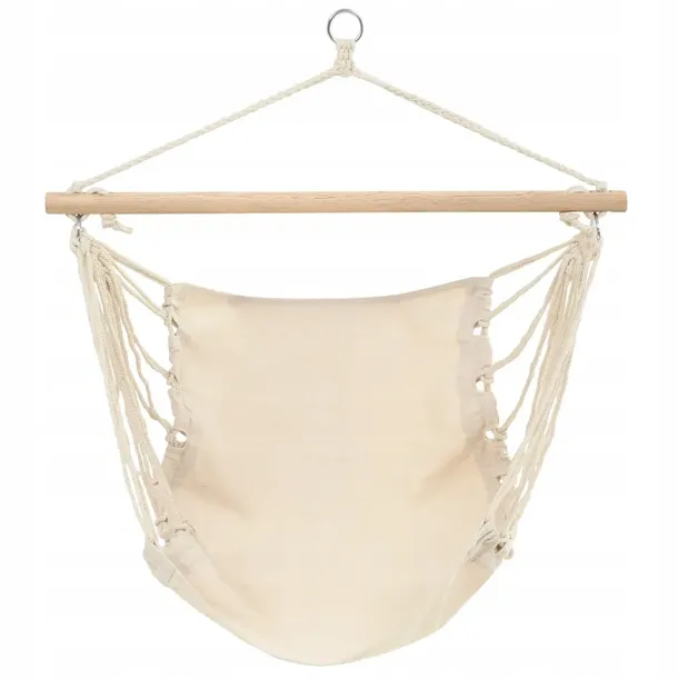 Kremowy hamak wykonany został na kształt wygodnego fotela. Świetnie sprawdzi się jako wygodny mebel ogrodowy. Materiał wykonania to bawełna z domieszką poliestru, oraz drewniana belka do zawieszenia. Dzięki metalowym pierścieniom, możesz bez problemu zawiesić swój wygodny fotel na palu, stojaku czy nawet drzewie. Wygodnie usiądzie w nim jedna osoba, a jego maksymalne obciążenie to 110 kg.