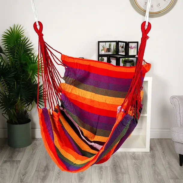 Hamak brazylijski w formie podwieszanego fotela. Solidna konstrukcja i wytrzymały materiał zapewnią komfort użytkowania. Fotel podwieszany jest odpowiednim rozwiązaniem, jeśli nie mamy miejsca na montaż tradycyjnego hamaka, gdyż jest montowany tylko w jednym miejscu. Fotel jest bardzo wygodny i zapewni długie godziny relaksu w ogrodzie, na tarasie, czy balkonie. Fotel można zamontować również w salonie, sypialni a nawet pokoju dziecięcym. Wyprodukowano zgodnie z europejskimi standardami.