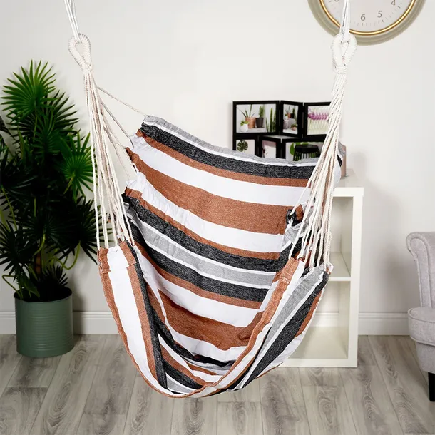 Hamak brazylijski w formie podwieszanego fotela. Solidna konstrukcja i wytrzymały materiał zapewnią komfort użytkowania. Fotel podwieszany jest odpowiednim rozwiązaniem, jeśli nie mamy miejsca na montaż tradycyjnego hamaka, gdyż jest montowany tylko w jednym miejscu. Fotel jest bardzo wygodny i zapewni długie godziny relaksu w ogrodzie, na tarasie, czy balkonie. Fotel można zamontować również w salonie, sypialni a nawet pokoju dziecięcym. Wyprodukowano zgodnie z europejskimi standardami.