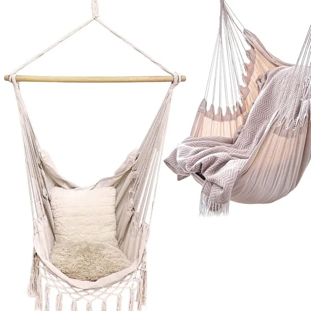 Hamak brazylijski w formie podwieszanego fotela. Solidna konstrukcja i wytrzymały materiał zapewnią komfort użytkowania. Fotel podwieszany jest odpowiednim rozwiązaniem, jeśli nie mamy miejsca na montaż tradycyjnego hamaka, gdyż jest montowany tylko w jednym miejscu. Fotel jest bardzo wygodny i zapewni długie godziny relaksu w ogrodzie, na tarasie, czy balkonie. Fotel można zamontować również w salonie, sypialni a nawet pokoju dziecięcym. ❗️UWAGA! Koc oraz poduszki nie są elementami zestawu. Oryginalny produkt holenderskiej marki Ambiance. Wyprodukowano zgodnie z europejskimi standardami.