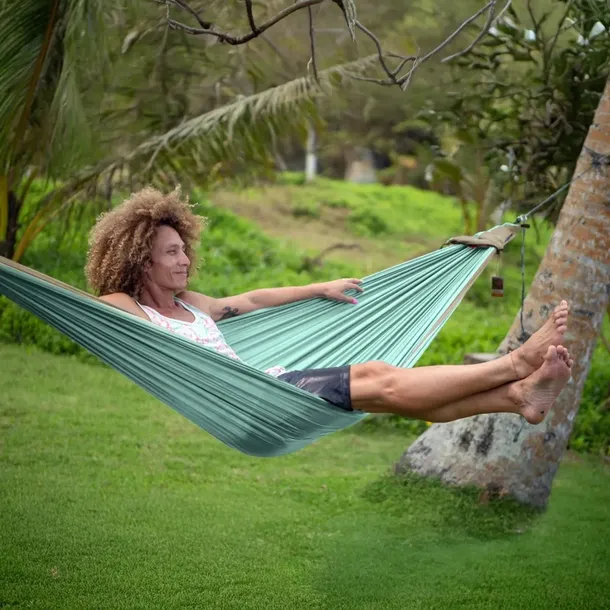 Trwałość zapewniona dzięki potrójnym szwom, szybkoschnący materiał odporny na pleśń. Wbudowany Express Setting Bag – pokrowiec transportowy i poduszka w jednym. Dodatkowa kieszeń boczna na drobiazgi oraz haczyki „S” lub karabinki w zestawie. Hamak wykonany z nylonu spadochronowego 70D jest oddychający, elastyczny, odporny na pleśń oraz szybkoschnący, dzięki czemu sprawdza się w każdych warunkach pogodowych. Potrójne szwy zwiększają trwałość, a maksymalne obciążenie do 200 kg zapewnia bezpieczeństwo i stabilność. Oddychający materiał doskonale dopasowuje się do ciała, wspierając krążenie krwi i zapobiegając przegrzaniu.