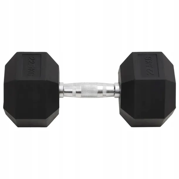 - Sześciokątna konstrukcja zapobiegająca toczeniu: sześciokątna forma zapobiega toczeniu się hantli po jej odłożeniu. Dlatego ten sprzęt treningowy sprawdzi się do szerokiej gamy różnego rodzaju złożonych ćwiczeń z obciążeniem.