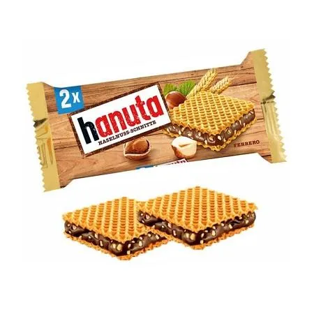 Hanuta to kultowy przysmak, który łączy chrupiące wafle z bogatym, kremowym nadzieniem orzechowo-czekoladowym. Każdy kęs to doskonałe połączenie intensywnego smaku prażonych orzechów laskowych i aksamitnej czekolady, zamknięte między lekkimi, złocistymi waflami.
