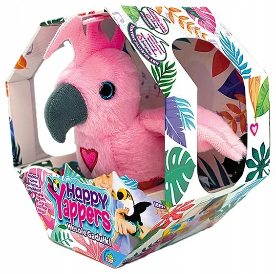 Happy Yappers /IT-9595/ Wesołe Gadułki - Kakadu Interaktywna pluszowa kakadu z serii Happy Yappers. Zabawka reaguje na dźwięki i ruch - porusza się, wydaje odgłosy i gada, zapewniając dzieciom dużo radości i śmiechu. Wykonana z miękkiego, bezpiecznego materiału. Idealna do zabawy i przytulania. Happy Yappers - Wesołe Gadułki Interaktywne pluszowe ptaki, które śpiewają, mówią, potrząsają skrzydłami i rozmawiają między sobą. Zabawki ładują się przez USB - bez wymiany baterii. Dostępne modele (sprzedawane osobno): * Tukan * Flaming * Wilga * Czerwona papuga * Kakadu * Niebieska papuga Specyfikacja (dot. wszystkich modeli): * Wysokość: ok. 20cm * Zasilanie: wbudowana bateria, ładowanie przez USB (kabel w zestawie) * Odtwarzanie dźwięku: gadające interakcje, odgłosy ptaków * Funkcjonalności: flapping wings, samoczynne rozmowy między ptakami, możliwość powtarzania słów * Materiał: miękki, bezpieczny plusz * Rekomendowany wiek: 3+ * Wysokość zabawki: ok. 20 cm * Wymiary opakowania: ok. 20 x 12 x 10 cm * Waga: ok. 0,3 kg * Zasilanie: Zabawki ładują się przez USB - bez wymiany baterii. * Rekomendowany wiek: 3+ Zabawka posiada funkcję automatycznego wyłączenia po czasie bezczynności. Produkt oficjalny, oryginalny.