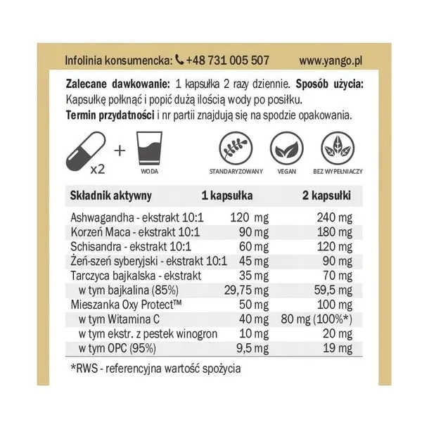 Składniki: ekstrakt 10:1 z korzenia ashwagandhy (Withania somnifera), ekstrakt 10:1 z korzenia maca (Lepidium meyenii), ekstrakt 10:1 z cytryńca chińskiego (Schisandra chinensis), mieszanka Oxy Protect™: kwas L-askorbinowy, ekstrakt z pestek winogron (Vitis vinifera) standaryzowany na zawartość min. 95% OPC (oligomeryczne proantocyjanidyny); ekstrakt z tarczycy bajkalskiej (Scutellaria baicalensis) standaryzowany na zawartość min. 85% bajkaliny; kapsułka: celuloza roślinna.