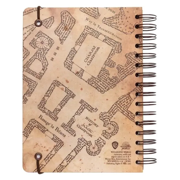 Notatnik A5 na spirali z twardą okładką świetnie sprawdzi się do notatek z lekcji czy wykładów jak również jako dziennik czy pamiętnik. Okładka jest ozdobiona estetyczną grafiką - Mapą Huncwotów. Notatnik posiada 90 kartek oraz jest zamykany na gumkę.