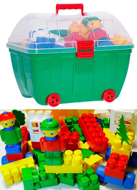 Kreatywne budowanie dostępne w poręcznym kuferku. Z blisko 70 elementów można wyczarować wiele ciekawych budowli i konstrukcji. Dzięki dołączonym drzwiom i oknom budynki stają się realistyczne. Samochody pomogą w transporcie materiałów budowlanych i nie tylko...