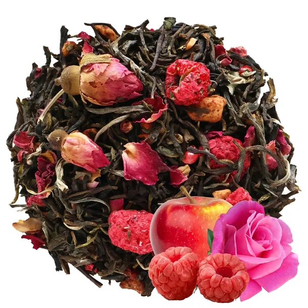 Herbata biała Róża i Malina to wyjątkowe połączenie delikatnej Fujian White z suszonymi owocami.