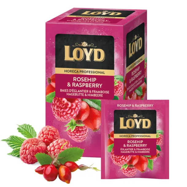 Loyd ROSEHIP & RASPBERRY – Herbatka owocowa ekspresowa, o smaku dzikiej róży i maliny. Owocowa mieszanka dająca energetyzujący i przyjemny napar charakterystyczny dla owocu dzikiej róży, który połączono ze słodką nutą maliny.