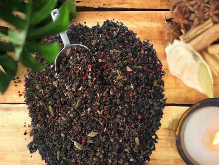 ☕️ Herbata Oolong Chai to smaczna mieszanka dobrej jakości herbaty typu oolong z grupą przypraw korzennych takich jak imbir, cynamon, goździki, kardamon, pieprz czerwony. Herbata ta ma wyraźnie rozgrzewające działanie.