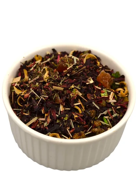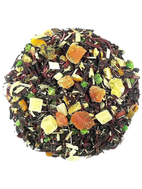 Skład: hibiskus, ananas kandyzowany( ananas, cukier,) mango kandyzowane (mango, cukier, regulator kwasowości-kwas cytrynowy, substancja konserwująca so2), papaja kandyz. (papaja, cukier, substancje konserwujące so2), pomarańcza kandyz. (skórka pomarańczy, cukier, syrop glukozowy, regulator kwasowości e330, substancja konserwująca E202, aromat), pomelo kandyz. (skórka pomelo 53,39%, cukier 44,59%, regulator kwasowości: kwas cytrynowy, konserwant: pirosiarczyn sodu, barwnik (E 102, E133), mięta pieprzowa, trawa cytrynowa, pomarańcza kwiat, aromat, kompozycja owoców 40%