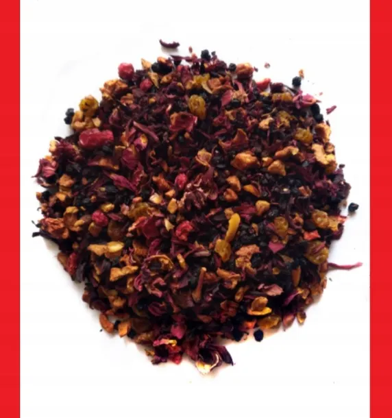 Składniki: jabłko, hibiskus, owoc czarnego bzu, rodzynki, truskawki, porzeczki i jeżyny liofilizowane, płatki róży, aromat owocowy