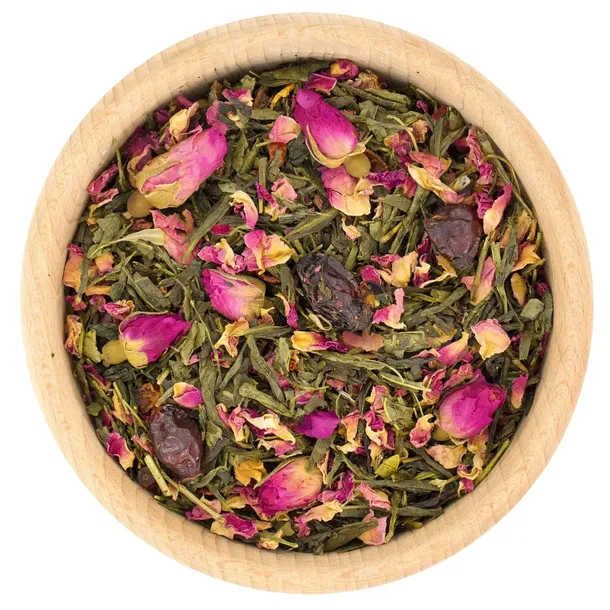 - herbata zielona Sencha, pączki róży (8%), płatki róży (8%), owoce dzikiej róży (10%), aromat