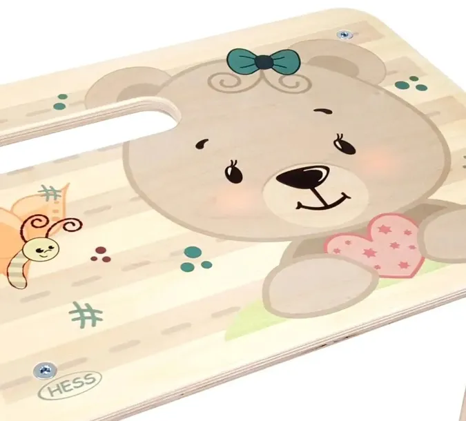 Ten solidny drewniany podnóżek z motywem misia ma wymiary ok. 33 x 24,5 x 17,5 cm i jest piękny i przyciąga wzrok do pokoju dziecięcego. Jest wszechstronnym pomocnikiem w codziennym życiu, czy to jako stołek do siedzenia, czy jako podwyższenie w pozycji stojącej. Ławka posiada duży otwór dostępowy, ułatwiający transport.