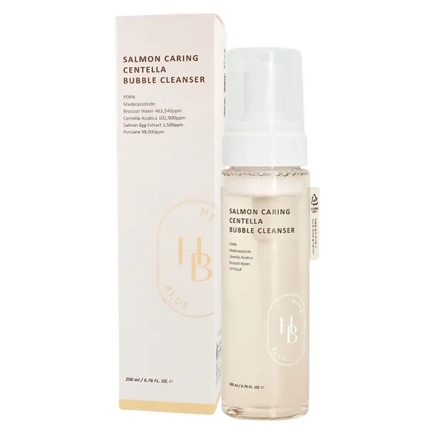 HEVEBLUE Salmon Caring Centella Bubble Cleanser to delikatna, ale skuteczna pianka oczyszczająca, która usuwa zanieczyszczenia, nadmiar sebum i resztki makijażu, nie naruszając naturalnej bariery ochronnej skóry. Dzięki połączeniu ekstraktu z jaj łososia i wąkroty azjatyckiej (Centella Asiatica), produkt nie tylko dogłębnie oczyszcza, ale także koi, nawilża i wspiera regenerację skóry. Jego lekka, puszysta konsystencja zapewnia przyjemne i komfortowe oczyszczanie każdego dnia. Do każdego typu skóry.