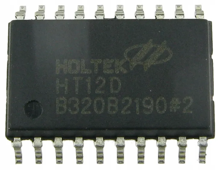 Układ scalony HT12D. Dekoder wykorzystywany w pilotach zdalnego sterowania. Obudowa: SMD, SO20. Zasilanie: 2,4-12VDC.