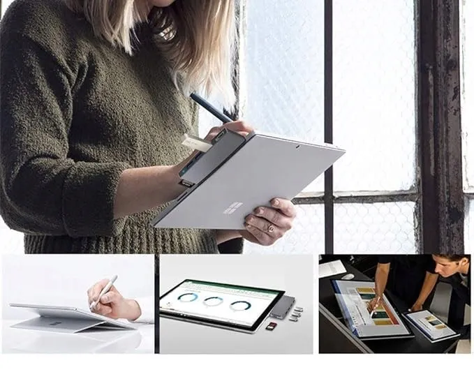 - Wielofunkcyjna stacja dokująca Microsoft Surface Pro - stacja dokująca 6 w 1 do Surface Pro 5/6 zawiera 1 wyjście HDMI 4K, 3 porty USB 3.0, 1 gniazdo na czytnik kart SD i 1 czytnik kart TF/Micro-SD