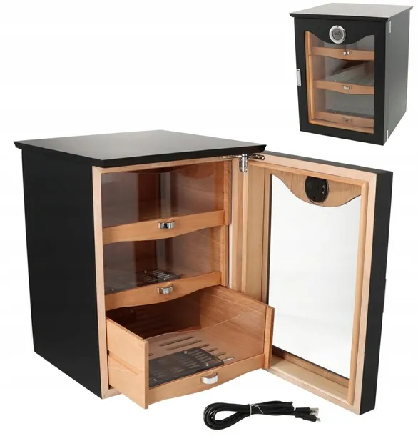 Humidor Jest Zamkniętym Pojemnikiem, Zwykle Wykonanym Z Drewna, Który Jest Wyposażony W System Nawilżania . Który utrzymuje w nich odpowiedni poziom wilgotności, cygara mogą być przechowywane niemal w nieskończoność. Poziom wilgotności jest mierzony i wyświetlany za pomocą Higrometru .