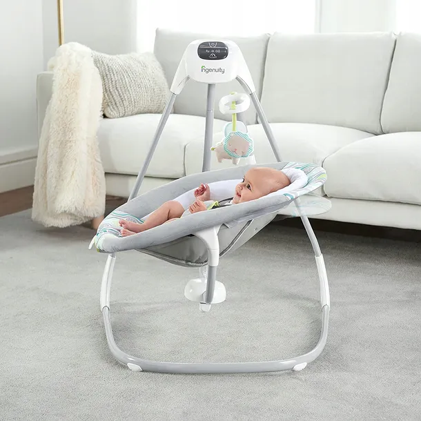 Ponadwymiarowe siedzisko z regulowanym oparciem można obrócić o 180 stopni, dzięki czemu rodzice będą uważniej obserwować dziecko. Dziecko może się poruszać w 3 różnych kierunkach. Dzięki superlekkiej ramie i łatwemu do wyciągnięcia uchwytowi, pełnowymiarowa przenośna huśtawka dla dziecka może być łatwo transportowana z pokoju do pokoju. A dzięki dołączonemu zasilaczowi sieciowemu nigdy więcej nie będziesz musiał wydawać pieniędzy na baterie. Panel kontrolny GentleTouch ™ pozwala dostosować huśtawkę do potrzeb dziecka. Huśtawka ma 8 melodii, 3 naturalne dźwięki i dźwięki szumu. Kojące wibracje sprawiają, że kołysanie staje się jeszcze przyjemniejsze. Huśtawka posiada timer, który można ustawić na 30, 45 i 60 minut. Technologia Truespeed ™ zapewnia 6 stałych prędkości, nawet gdy dziecko rośnie. Dzięki technologii WhisperQuiet ™ dziecko może kołysać się bez zakłóceń. Pałąk jest ozdobiony dwoma uroczymi pluszowymi figurkami, z którymi dziecko może wchodzić w interakcje. Materiał zdejmowany do prania w pralce.