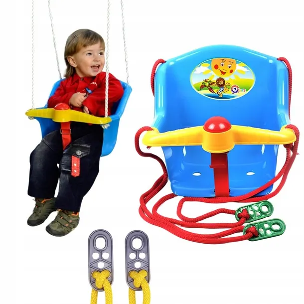 Huśtawka dostępna w trzech kolorach: czerwony, niebieski i zielony. Wyposażona w klakson.