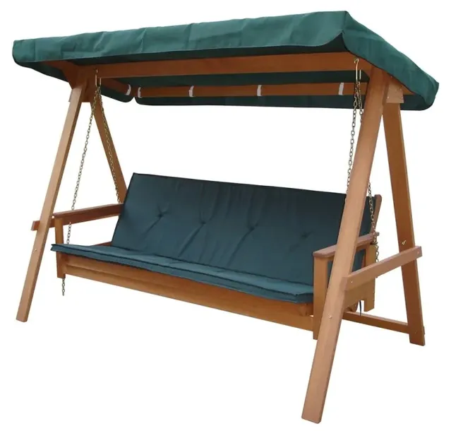 Ogromna huśtawka ogrodowa wykonana z drewna tropikalnego MERANTI. Poduszki i baldachim w kolorze zielonym - w zestawie. Produkt wysokiej jakości! Meranti to oznaczenie wielu gatunków gatunków Shorea pochodzących z Azji Południowo-Wschodniej. Drewno to znalazło zastosowanie głównie na zewnątrz do produkcji mebli ogrodowych, okien i drzwi ze względu na doskonałą trwałość i łatwość obróbki. Oprócz atrakcyjnego wyglądu Meranti charakteryzuje się wysoką twardością, odpornością na warunki atmosferyczne i długą żywotnością.