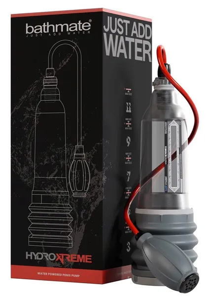 MORE penis with the natural power of water!The Transparent Water Power Penis Pump HydroXtreme8 from Bathmate is for men who want a permanent increase in penis size, erection quality and stamina. It is easy to use and can just be used with water and a ball pump for enormously effective hydro-vacuum training. Relax in the bath or the shower! The water in the hydro penis pump creates a strong and even suction force around the penis so that the tissue can expand completely and evenly. If required, the pressure in the cylinder can be increased with the handy ball pump. This means that every user can find their own individual penis enlargement programme. Very strong for experts – but also gentle for beginners. With regular use, lasting results can be seen and experienced.Transparent cylinder with a measuring scale. The sealing soft sleeve ensures a high level of comfort at the base of the penis and testicle area during training. Perfect for (erect) penis lengths 15–20 cm.Included in delivery: Hydro penis pump with a ball pump and hose attachment, shower strap, comfortable cushion pad, sponge, cleaner, storage bag, towel and a padlock.PC, TPE.