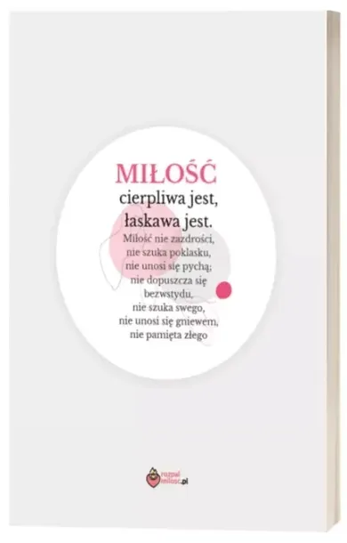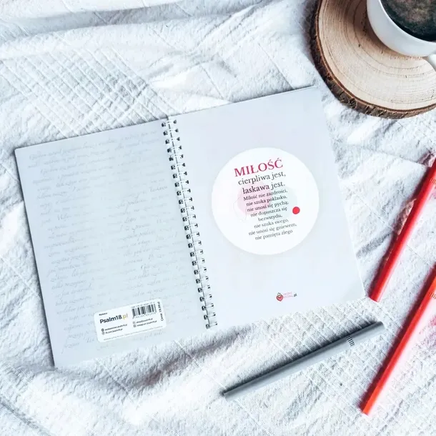 Ładny i praktyczny notatnik w linię, na metalowej spirali. Daje to wygodę przy robieniu notatek – notes można położyć na płasko, otwarty na dowolnej stronie. Każda strona zawiera krótki fragment „Hymnu o miłości” (1 List do Koryntian, 13 rozdział), co może być inspiracją niezależnie od tego, na jaki temat są nasze notatki. Cytaty pochodzą z IV wydania Bilii Tysiąclecia.