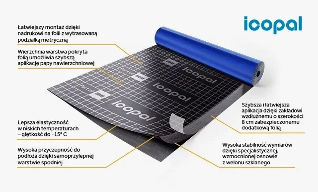 ICOPAL PAPA PODKŁADOWA PLASTER V SBS to specjalistyczna papa asfaltowa modyfikowana elastomerem SBS, produkowana na osnowie z welonu szklanego. Produkt został zaprojektowany jako samoprzylepna warstwa podkładowa, wyposażona w system szybkiego montażu bez użycia otwartego ognia w pierwszej fazie aplikacji. Konstrukcja papy obejmuje wierzchnią folię z tworzywa sztucznego oraz spodnią warstwę z aktywnego asfaltu samoprzylepnego, zabezpieczonego zdejmowalną folią silikonowaną.