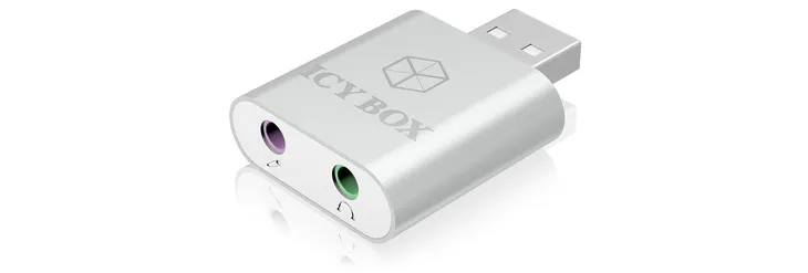 ICY BOX IB-AC527. Interfejs hosta: USB, Wtyk słuchawek: 3,5 mm. Zestaw układów: C-Media HS-100B, Kolor produktu: Srebrny, Biały. Waga produktu: 10 g, Szerokość produktu: 28 mm, Głębokość produktu: 43 mm. Materiał obudowy: Aluminium. Kraj pochodzenia: Chiny, Szerokość skrzyni zbiorczej (zewnętrznej): 320 mm, Długość skrzyni głównej (zewnętrznej): 560 mm