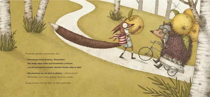 Kiedy Wiewiórka się budzi, dzień trwa już w najlepsze. W naczyniu z orzeszkami laskowymi znajduje tajemniczą kopertę. Czyta list… i po chwili pędem wybiega z domu. Mknie ile sił w łapkach, ale w drodze przez łąki i las, co chwilę zatrzymują ją przyjaciele, którzy potrzebują pomocy. Co robić? Mimo pośpiechu Wiewiórka nikomu nie odmawia. Zastanawia się tylko, czy zdąży na czas, czy aby nie zjawi się w nieodpowiednim momencie. Gdy w końcu dociera na miejsce, coś sobie przypomina i zamiera jak sparaliżowana: zapomniała o prezencie! Wsadza łapkę do plecaka, choć wie, że przecież niczego tam nie znajdzie. Ku jej zaskoczeniu z plecaka wysypują się jednak: kwiaty, szalik, brzoskwinia… Wiewiórka aż podskakuje z radości. Przez cały dzień przyjaciele z wdzięczności za pomoc wsuwali jej do plecaka różne cudeńka, a ona, zabiegana, nawet tego nie zauważyła. Ale dokąd właściwie zmierza Wiewiórka? Dlaczego się tak spieszy? I dla kogo ten prezent? Piękna i wzruszająca opowieść o przyjaźni, wdzięczności i bezinteresownej pomocy. Najnowsza książka autorów innych uwielbianych przez dorosłych i dzieci tytułów kolekcji „OQO” – Siedem łóżek malutkiej Popielicy, Nie trzeba słów, Najlepsza zupa na świecie, Niedźwiedź – łowca motyli.