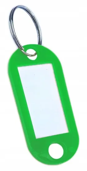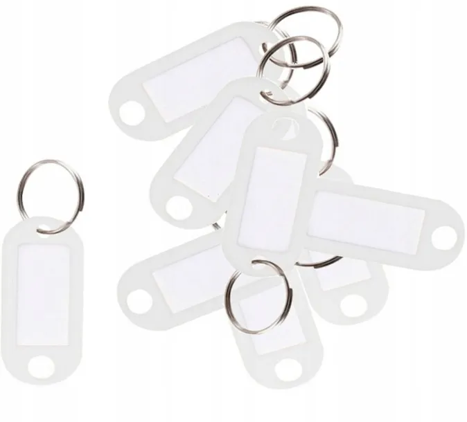 Plastikowe zawieszki przeznaczone do oznaczania kluczy. Umożliwiają szybką identyfikację właściwego klucza. Drugi otwór umożliwia przytwierdzenie dodatkowego klucza. Opakowanie zawiera 10 sztuk w kolorze białym.