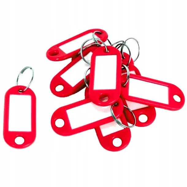 Plastikowe zawieszki przeznaczone do oznaczania kluczy. Umożliwiają szybką identyfikację właściwego klucza. Drugi otwór umożliwia przytwierdzenie dodatkowego klucza. Opakowanie zawiera 10 sztuk w kolorze czerwonym.