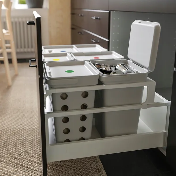 W kuchni zamontuj pojemniki do sortowania odpadów jak najbliżej zlewu, ponieważ to tam powstaje większość odpadów.