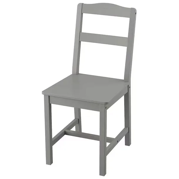 - Tradycyjne drewniane krzesło do kuchni/jadalni z oparciem z poziomymi szczebelkami w kolorze szarym pięknie się komponuje ze stołami HAUGA.