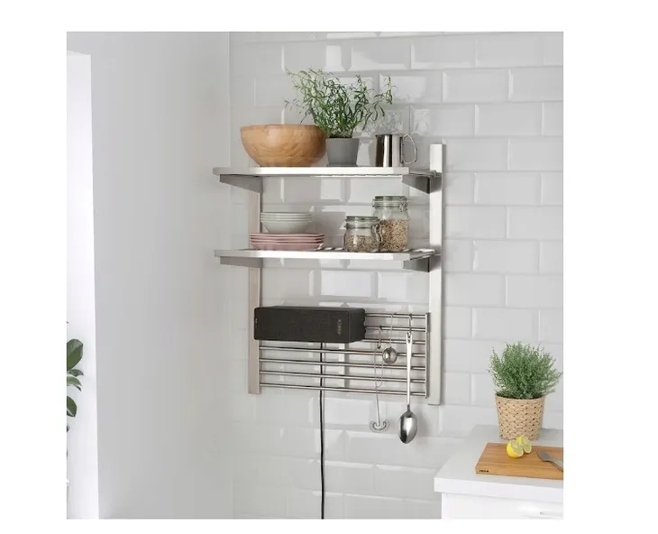 - Zawieś głośnik SYMFONISK na ścianie, aby zaoszczędzić miejsce w kuchni. Za pomocą tego haczyka z łatwością zawiesisz go na drążku KUNGFORS lub FINTORP - bez zajmowania cennego miejsca na blacie.