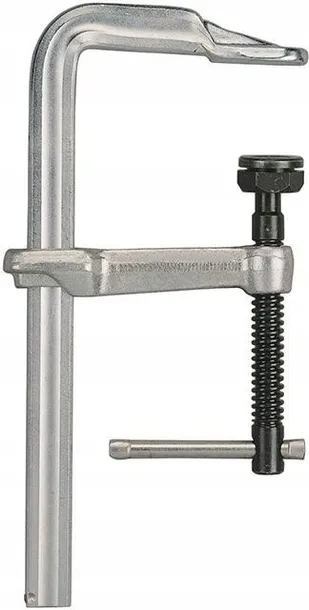 Wykonanie: prowadnica, ramię stałe i płytka dociskowa wykonane w całości ze statycznie optymalizowanego, ciągnionego na zimno profilu stalowego; ramię ruchome z odkuwanej i galwanicznie ocynkowanej stali ulepszanej cieplnie; lekkobieżna śruba dociskowa z walcowanym, umacnianym przez zgniot i oksydowanym gwintem trapezowym; ruchoma specjalna płytka dociskowa, odchylana do 35°. Z pokrętłem z przetyczką.